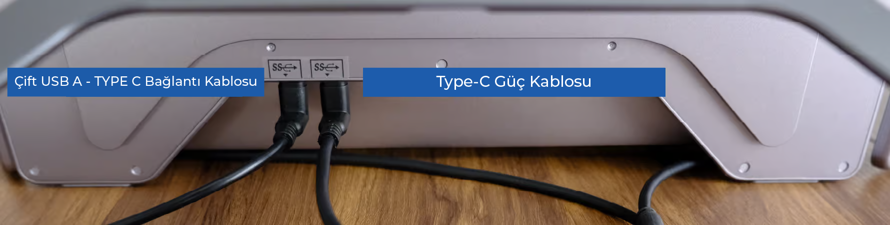 Bilgisayarınızda USB-A girişleri varsa resimde gösterilen çift USB-A uçlu kablonun bir ucunu güç, diğer ucunu görüntü aktarımı için bilgisayarınıza bağlayabilirsiniz